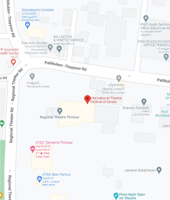Kerala Sangeetha Nataka Akademi (KSNA), under the department of culture, Govt of Kerala is based at Thrissur in the cultural capital of Kerala. KSNA, since its inception in 1958 has been promoting indigenous theatre and music of Kerala. When the Governing body of Kerala Sangeetha Nataka Academy was headed by Film /stage actor and author Murali, the international theatre festival of Kerala began in 2008.The first ever edition of the festival had Asian focus as highlight, African theatre, Latin American theatre, Classics revisited, Eastern European theatre, Spectatorship & Gender, Body, Street performances and Imagining communities were the thematic focus of editions that had ensued. After a hiatus of two years the international theatre festival of Kerala is now getting kick started on the theme "Humanity must unite".